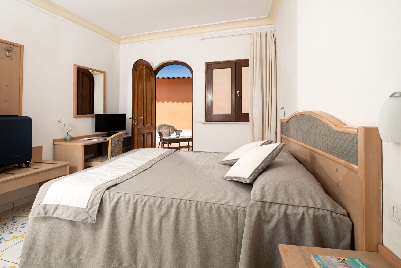 Camera doppia standard, situata sulla terrazza tra i giardini dell'hotel. Luminosa e dotata di aria condizionata, TV, phon, minibar e cassaforte. Può essere configurata con letto matrimoniale o letti singoli. Prima colazione inclusa.